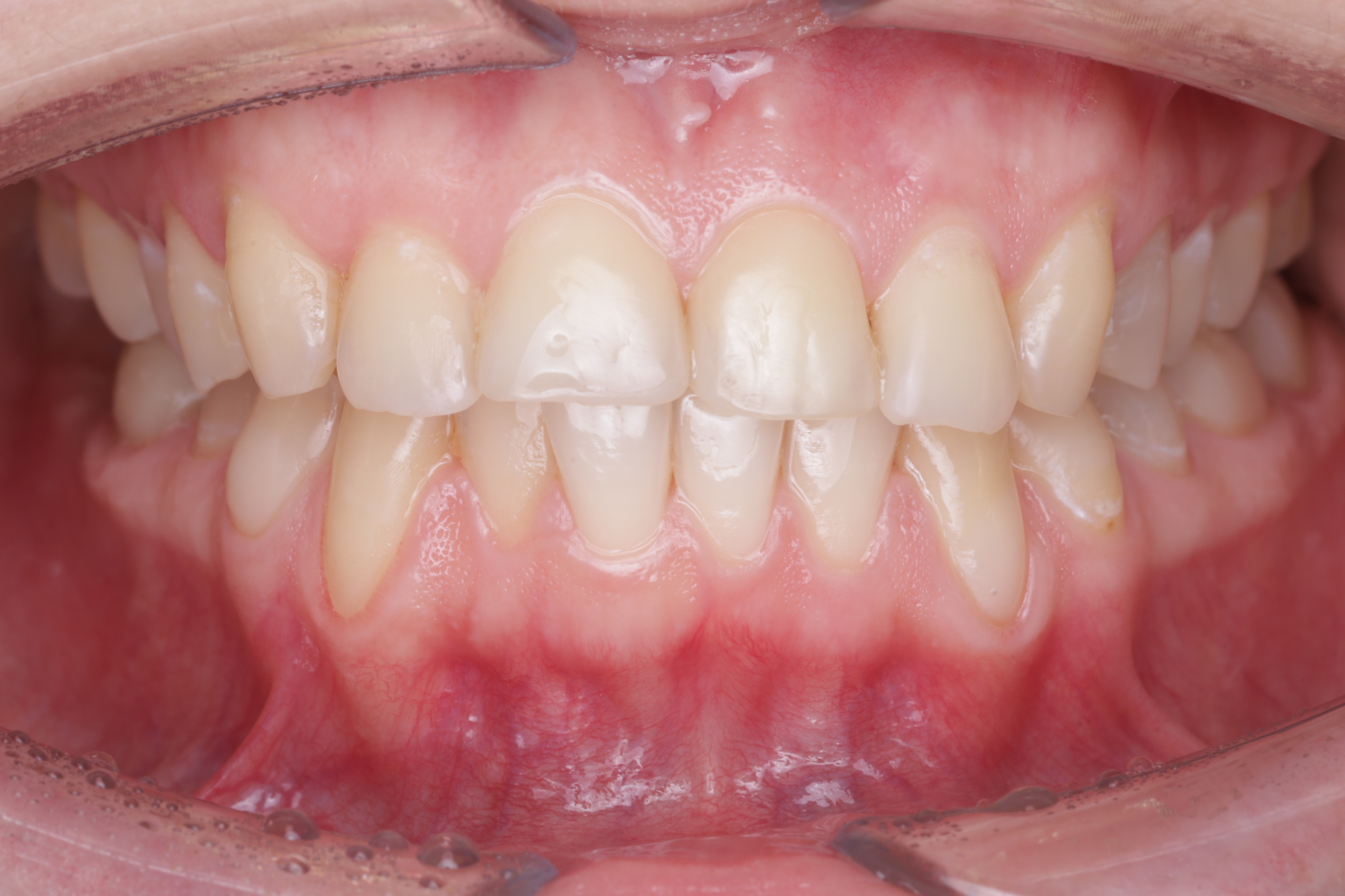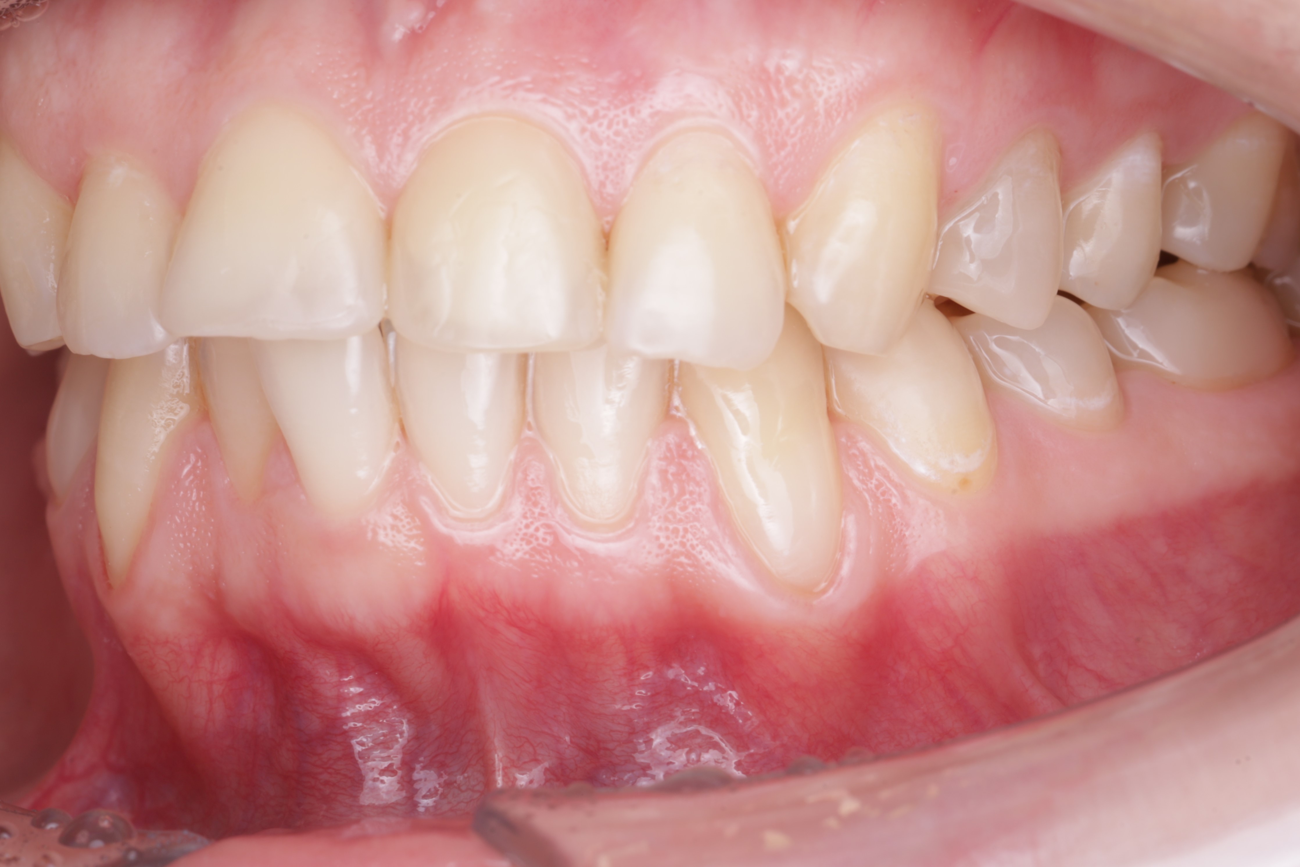 Спустя два месяца ортодонт зафиксировал брекеты. Мы видим полное закрытие рецессий и увеличение толщины десны. Это делает ортодонтическое лечение безопасным, а вероятность возникновения рецессий десны в дальнейшем — минимальной или практически невозможной