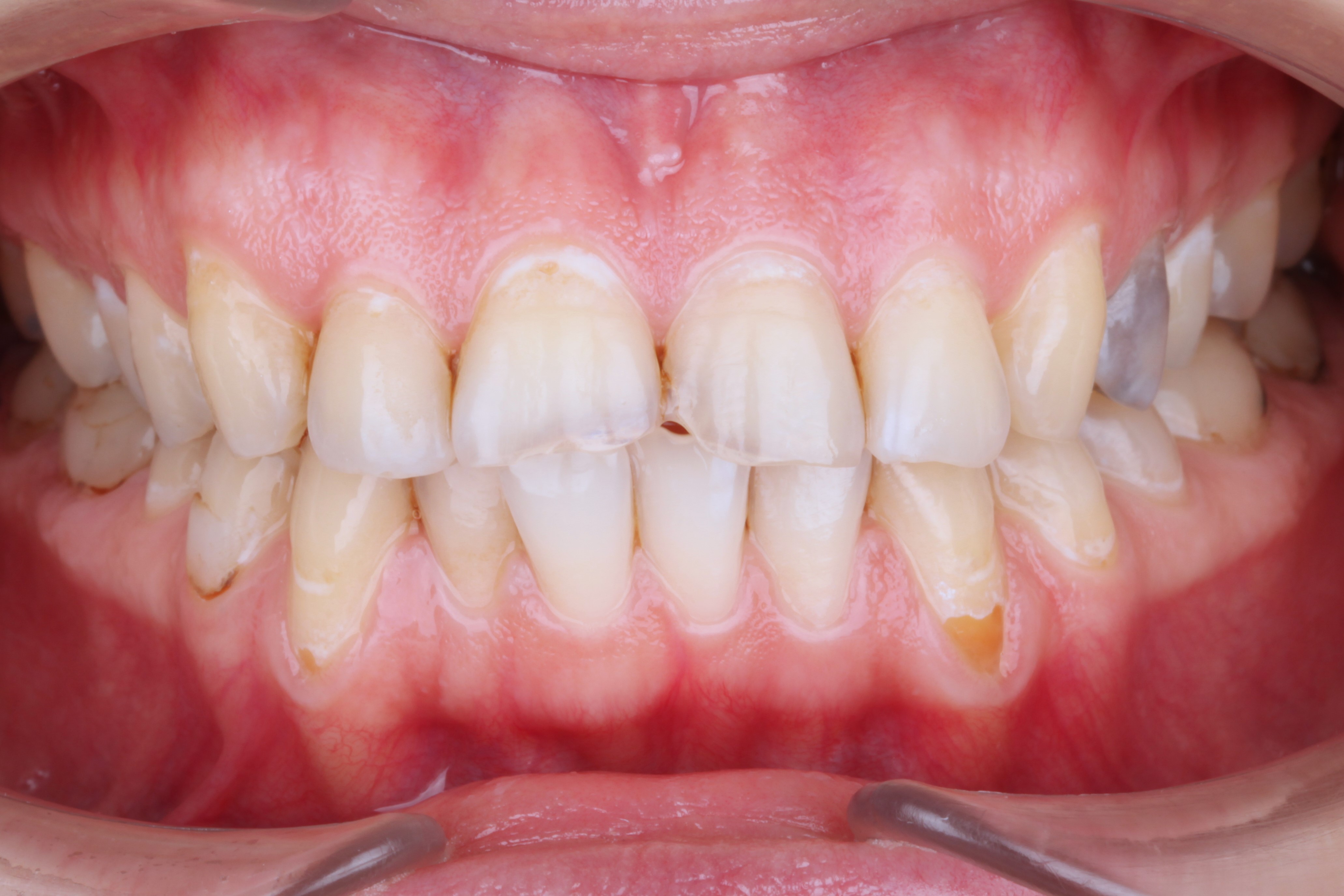 В данной клинической ситуации было принято решение провести санацию полости рта, затем закрыть рецессии в области нижних клыков и только потом приступить к ортодонтии.