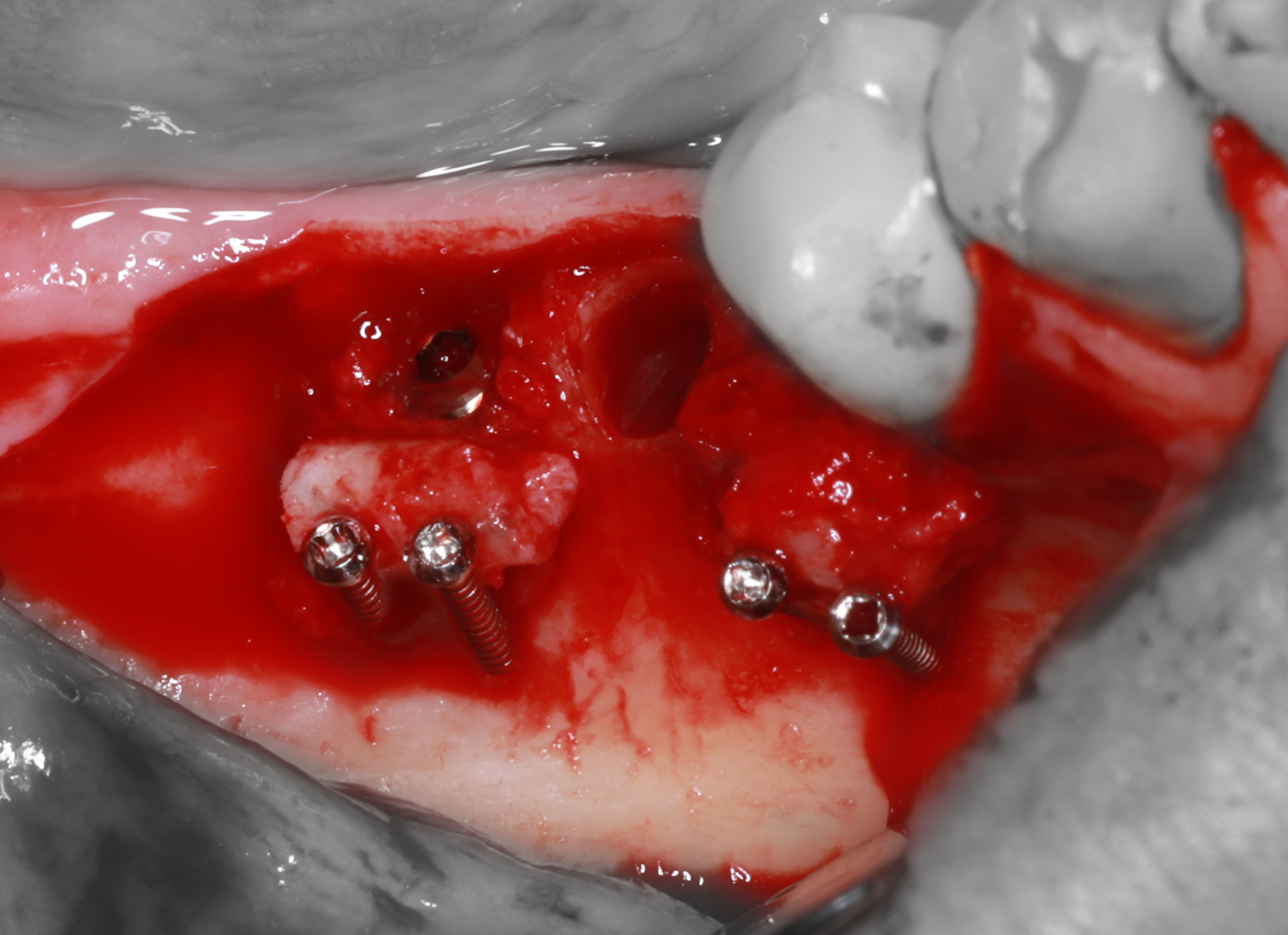 6) Установлен мезиальный имплантат, фиксирован костный трансплантат с помощью прижатия винтами (1мм.*10мм.)
