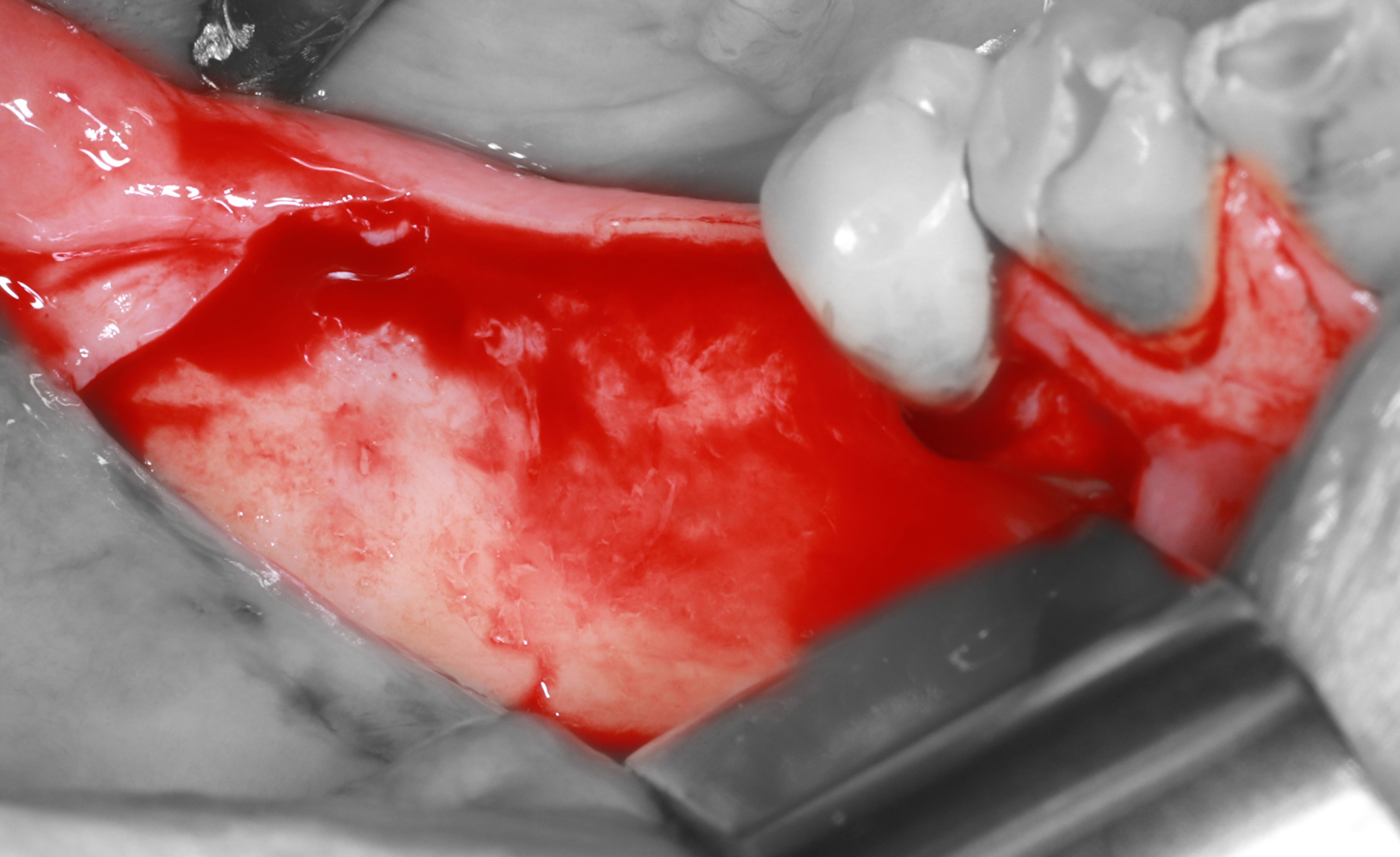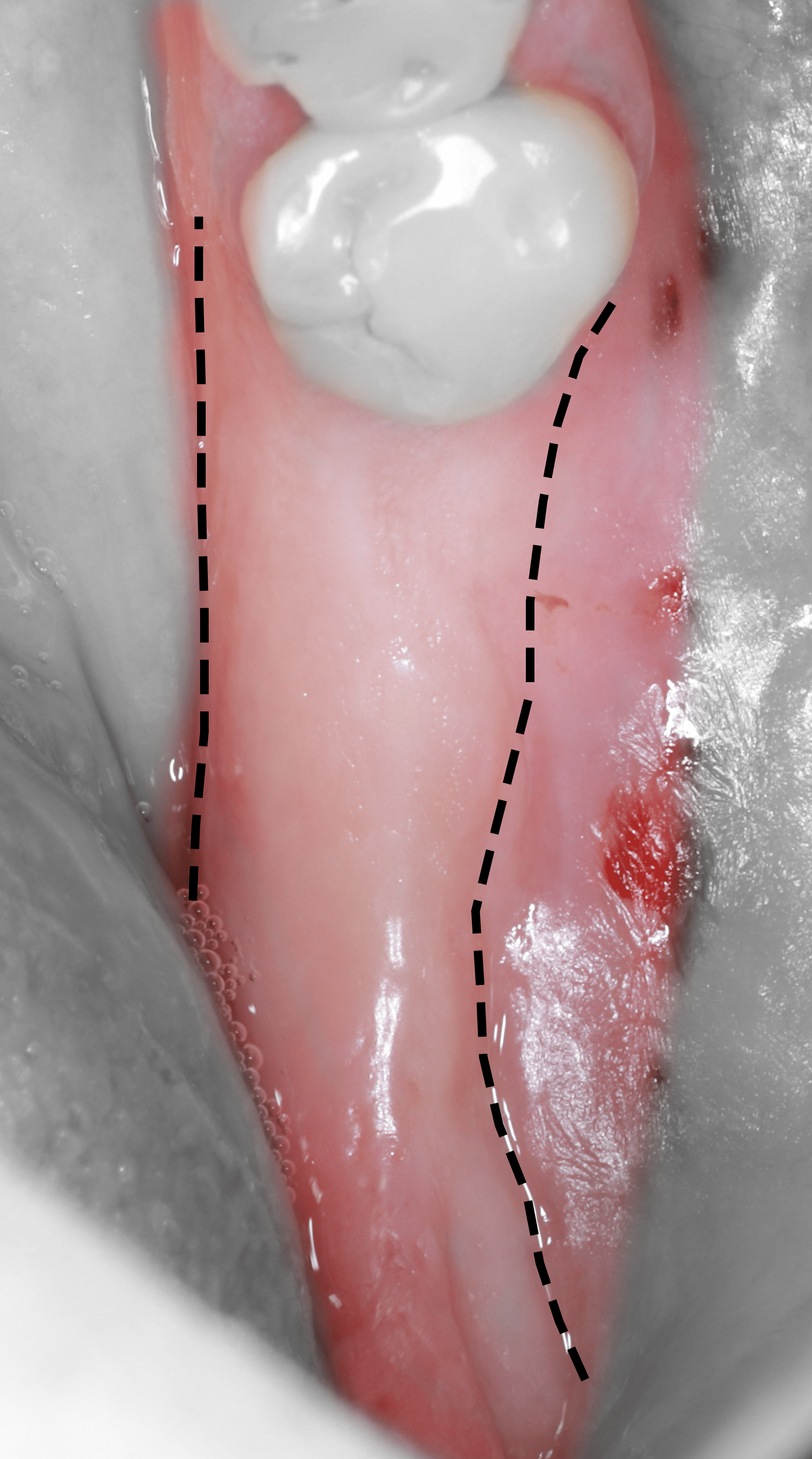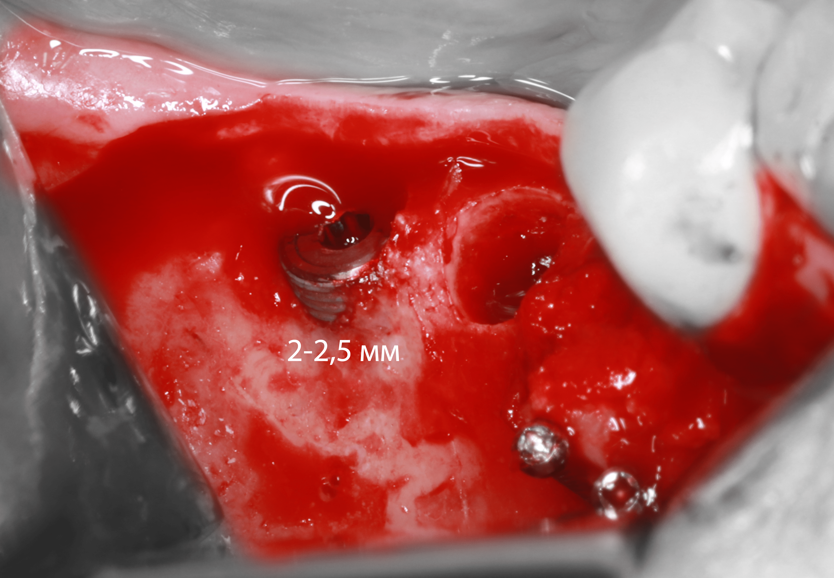 7) Установлен дистальный имплантат - дегистенция имплантата глубиной 2-2,5 мм.