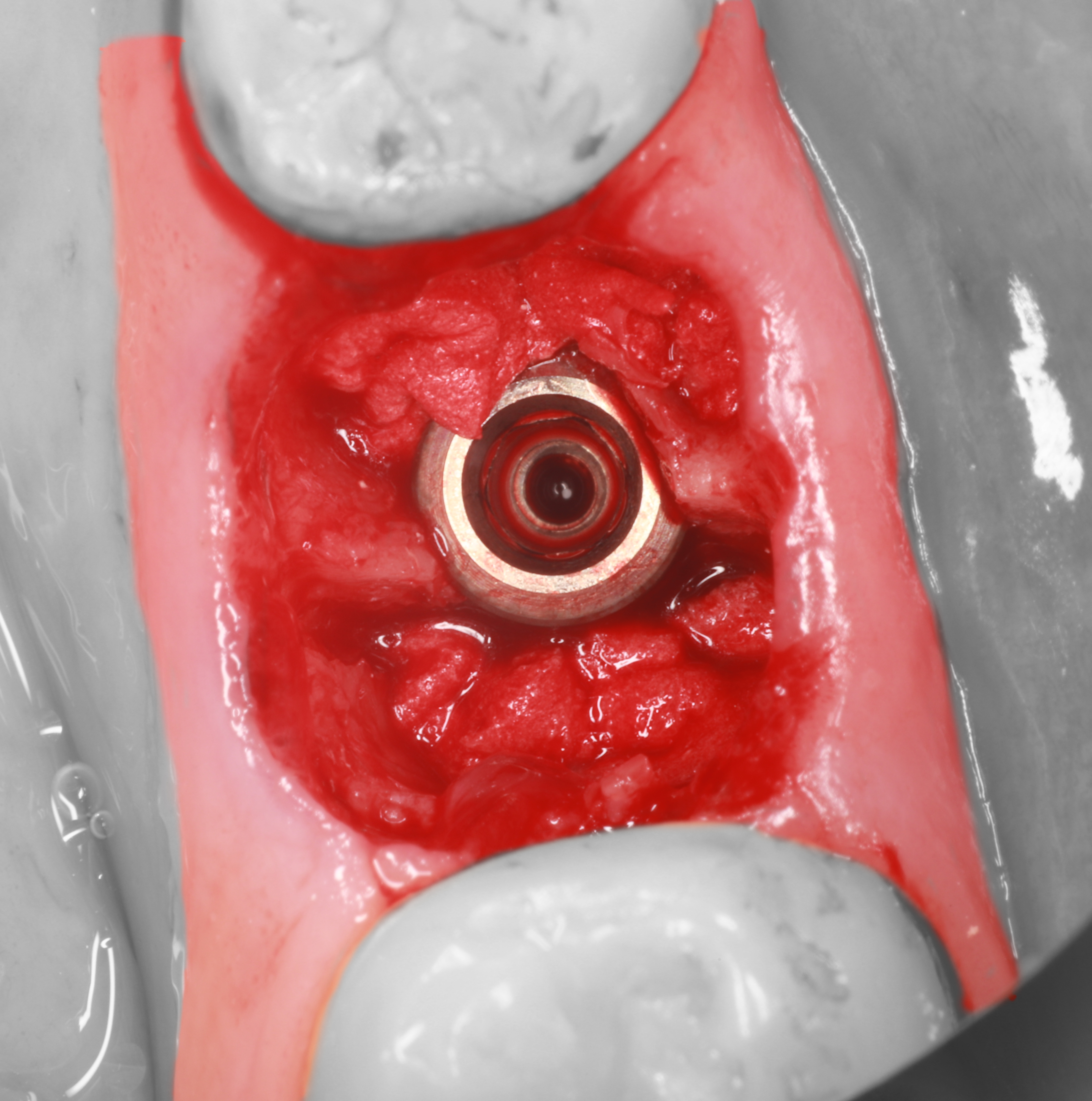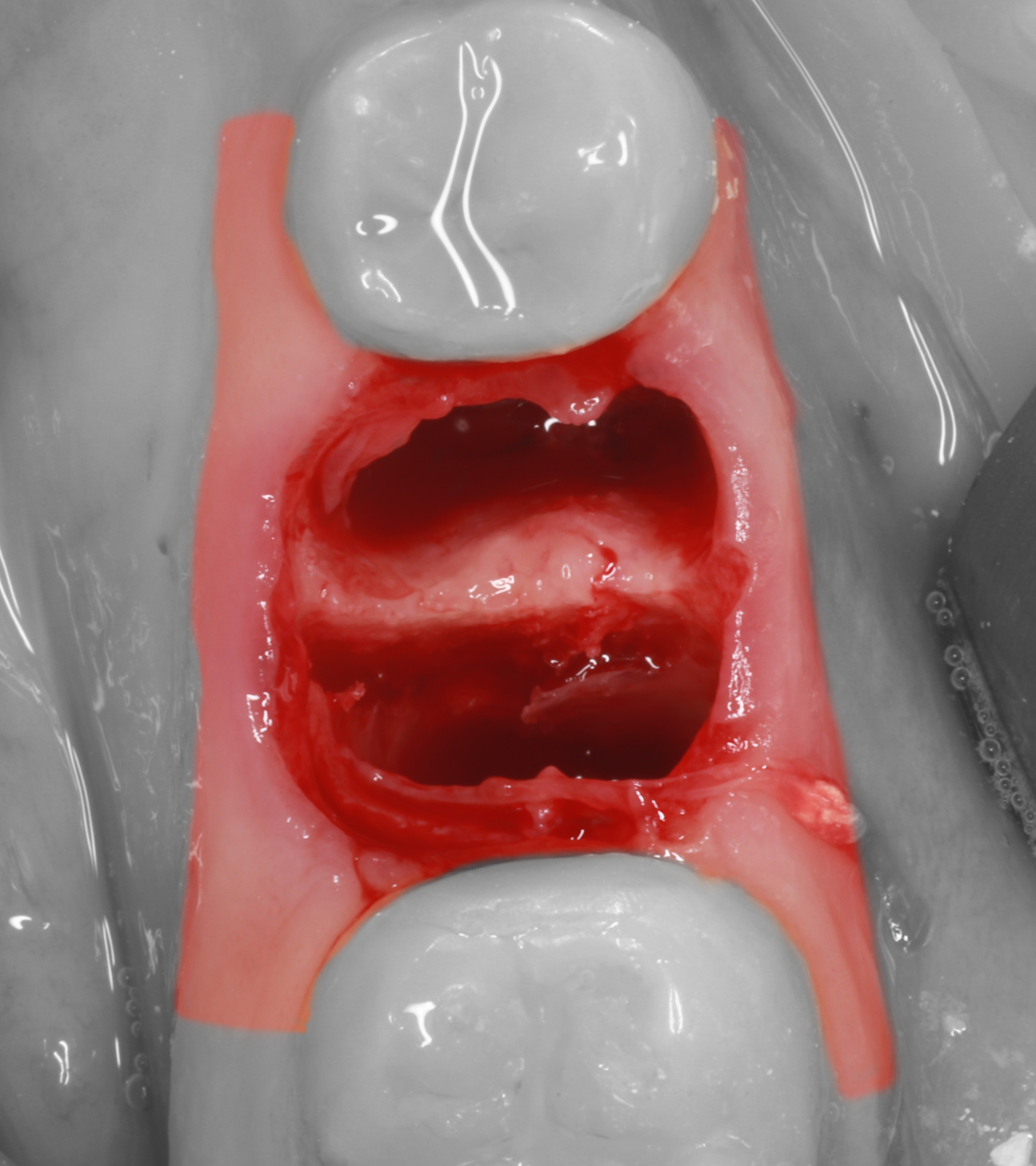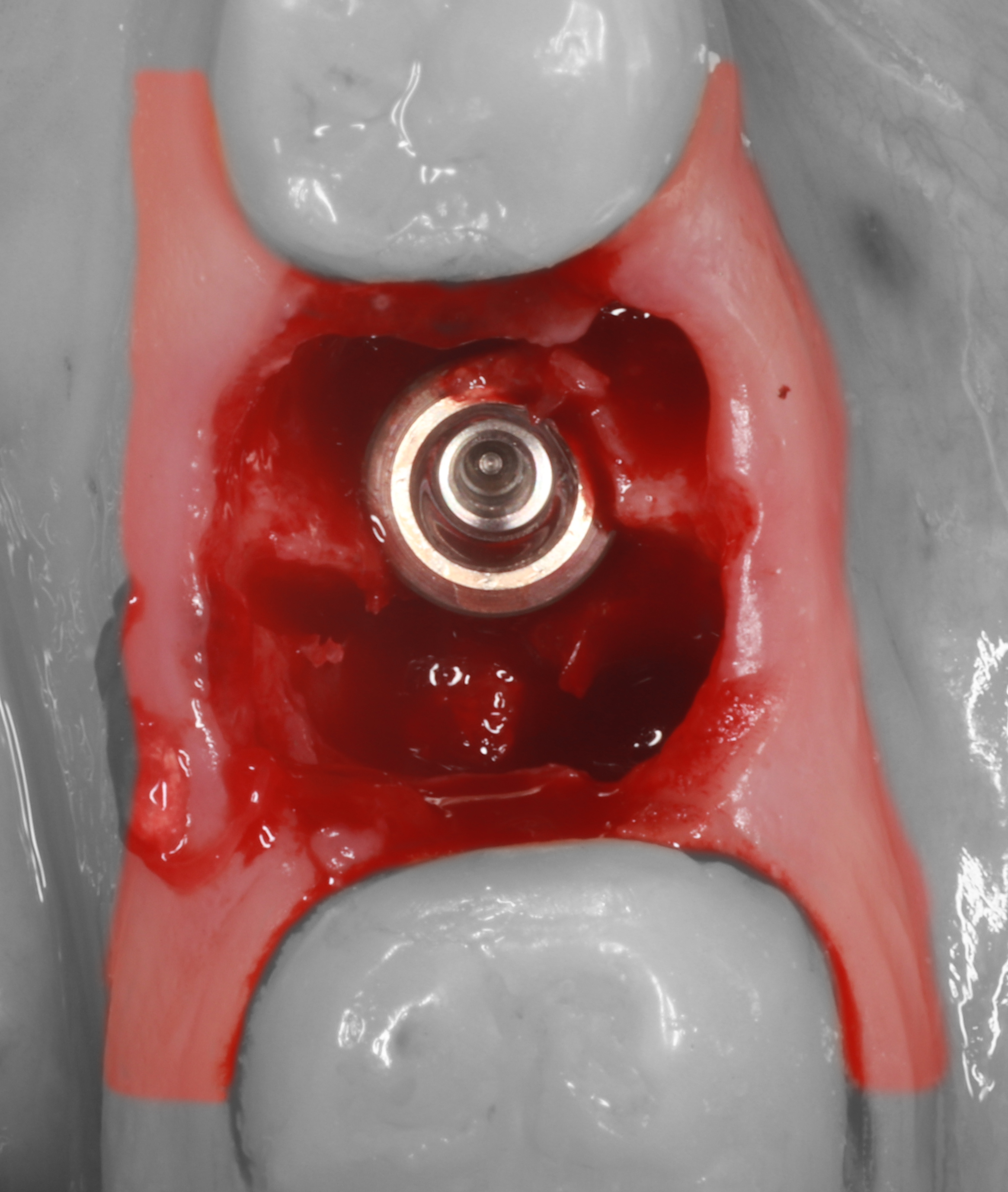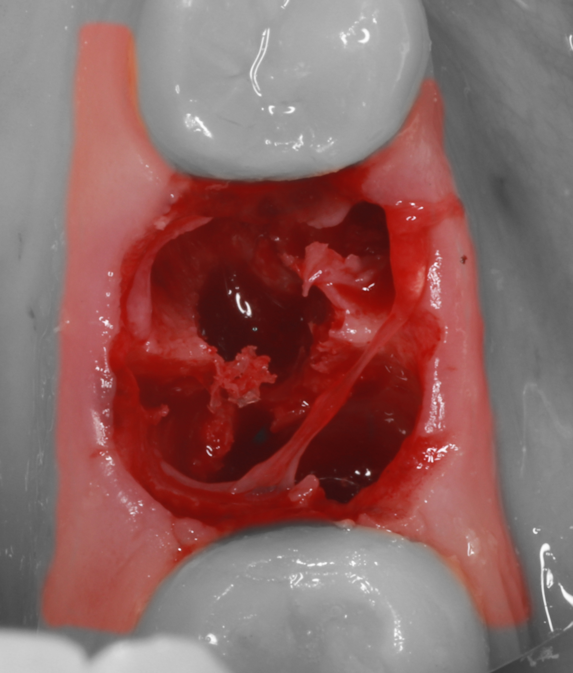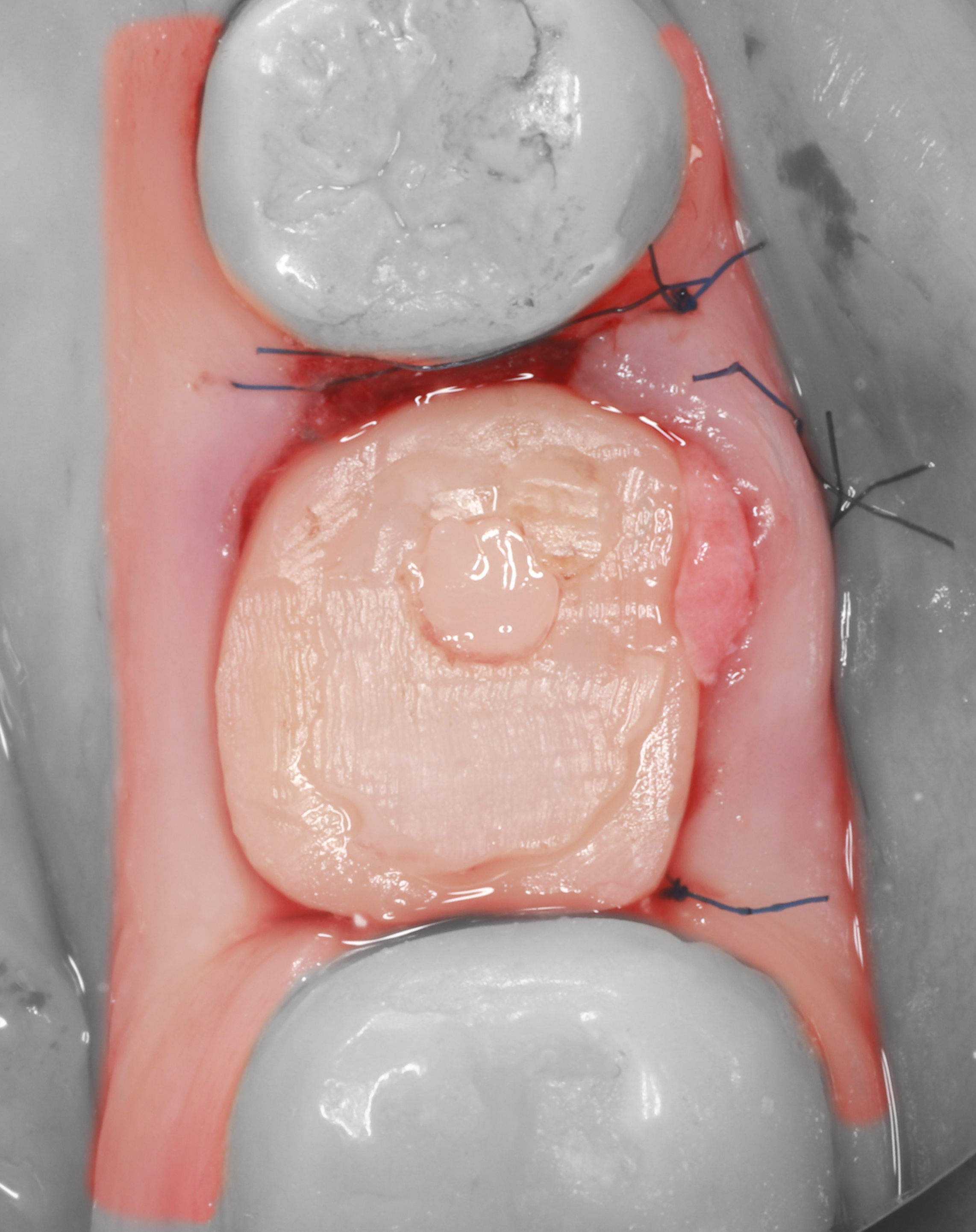 9) Костная часть лунки аугментирована с помощью ксеногенного коллагенового материала "Коллапол".