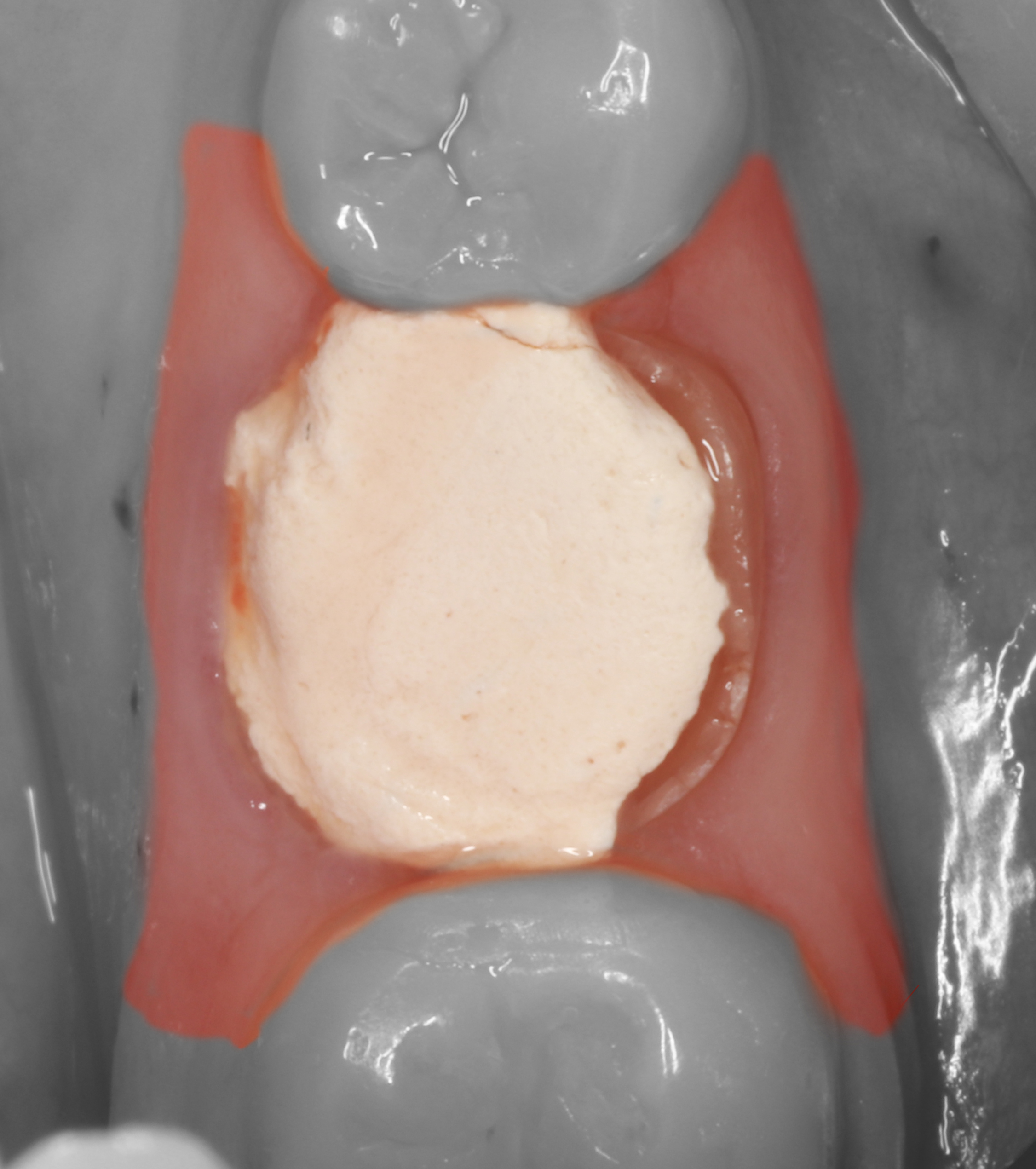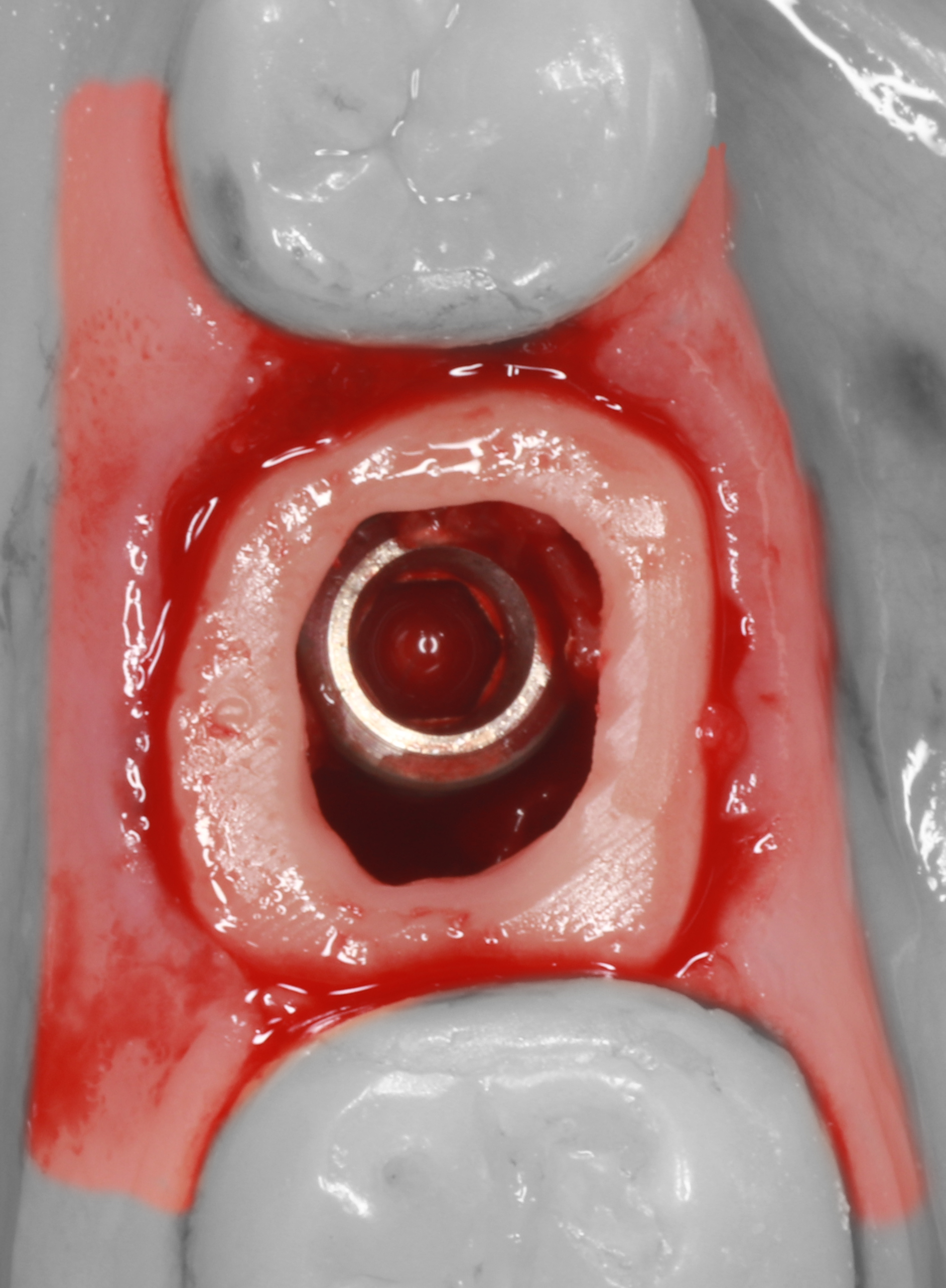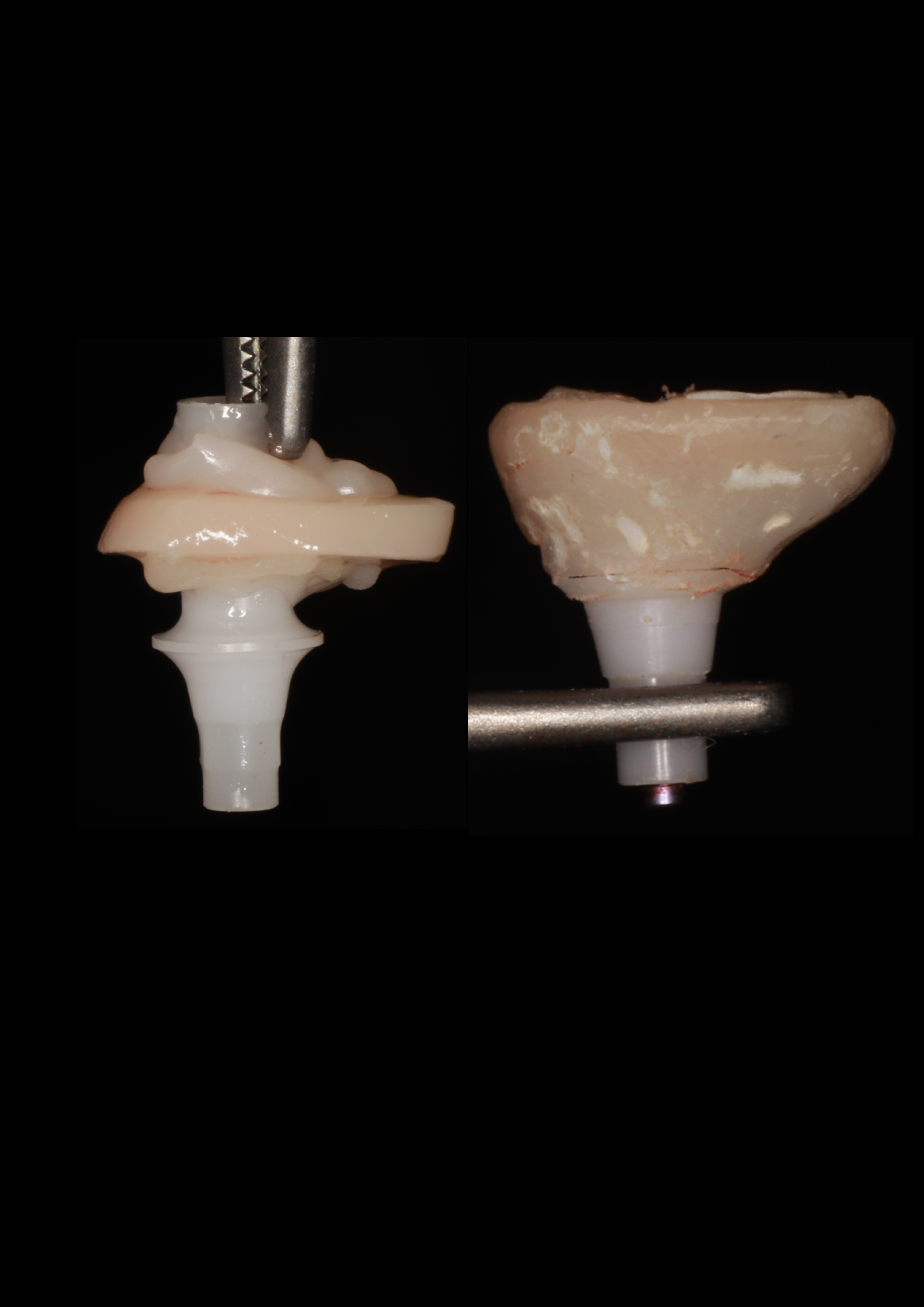 7) Припасована заготовка иФДМ. В имплантат вкручен временный абатмент. Заготовка и абатмент приклеены друг к другу с помощью жидкотекучего композита.