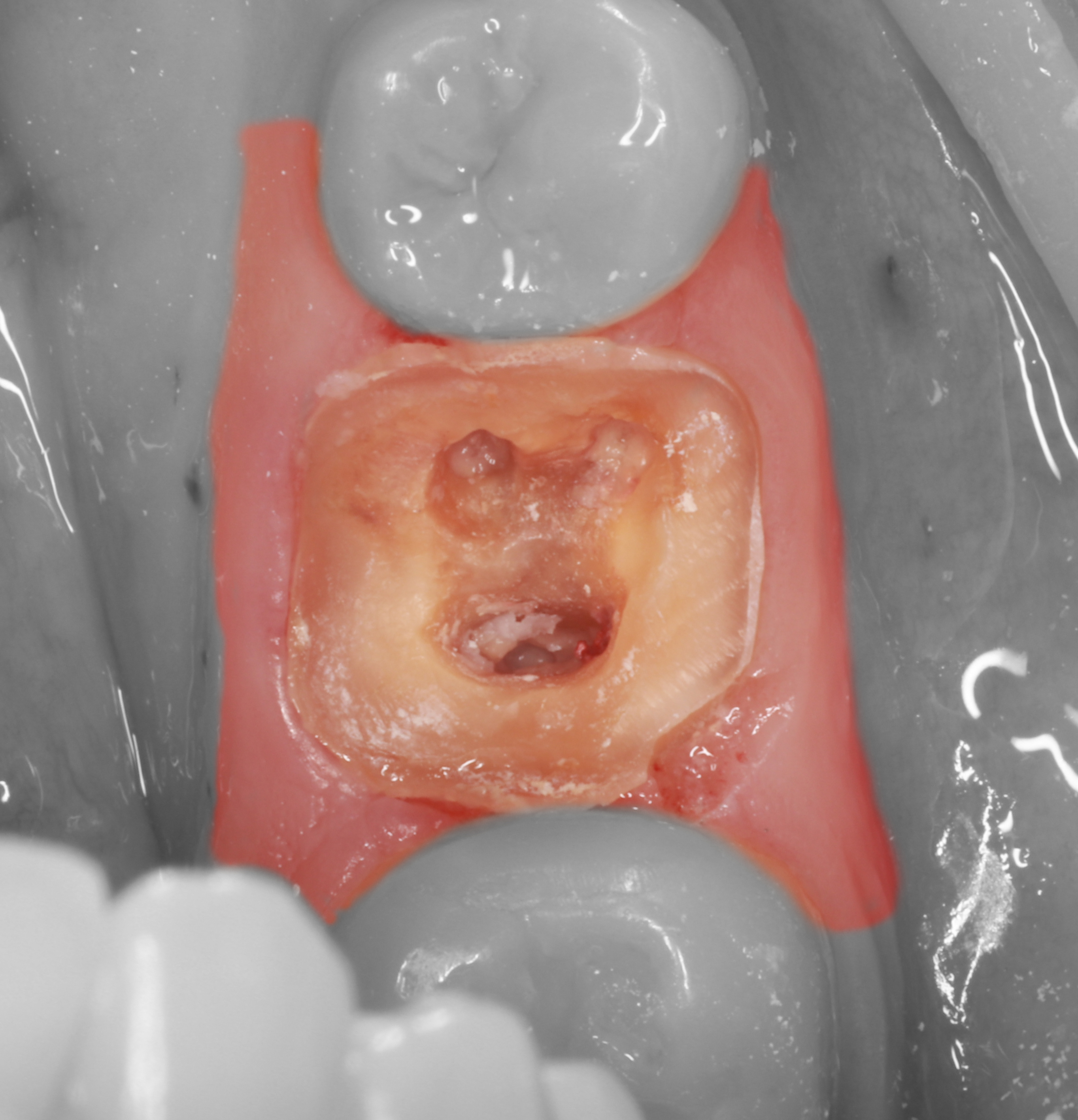 2) С помощью фрезы Линдемана была отделена коронка зуба. Так как теперь видны устья корневых каналов, сегментация зуба на мезиальный и дистальный корни значительно упрощается.