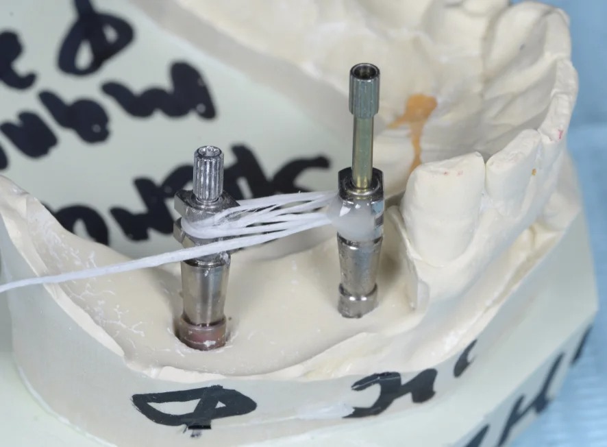 - Каждому участнику будут предоставлены фантомные модели с аналогами имплантатов и мягкой десной, на которых будут отрабатываться практические навыки. Участники индивидуализируют пластмассовые ложки, сделают в них отверстие , после чего установят трансферы в аналоги. После этого свяжут их флосом, изготовят трансфер чек, распилят его. Снимут оттиск с трансфер-чеком методом «открытой ложки».