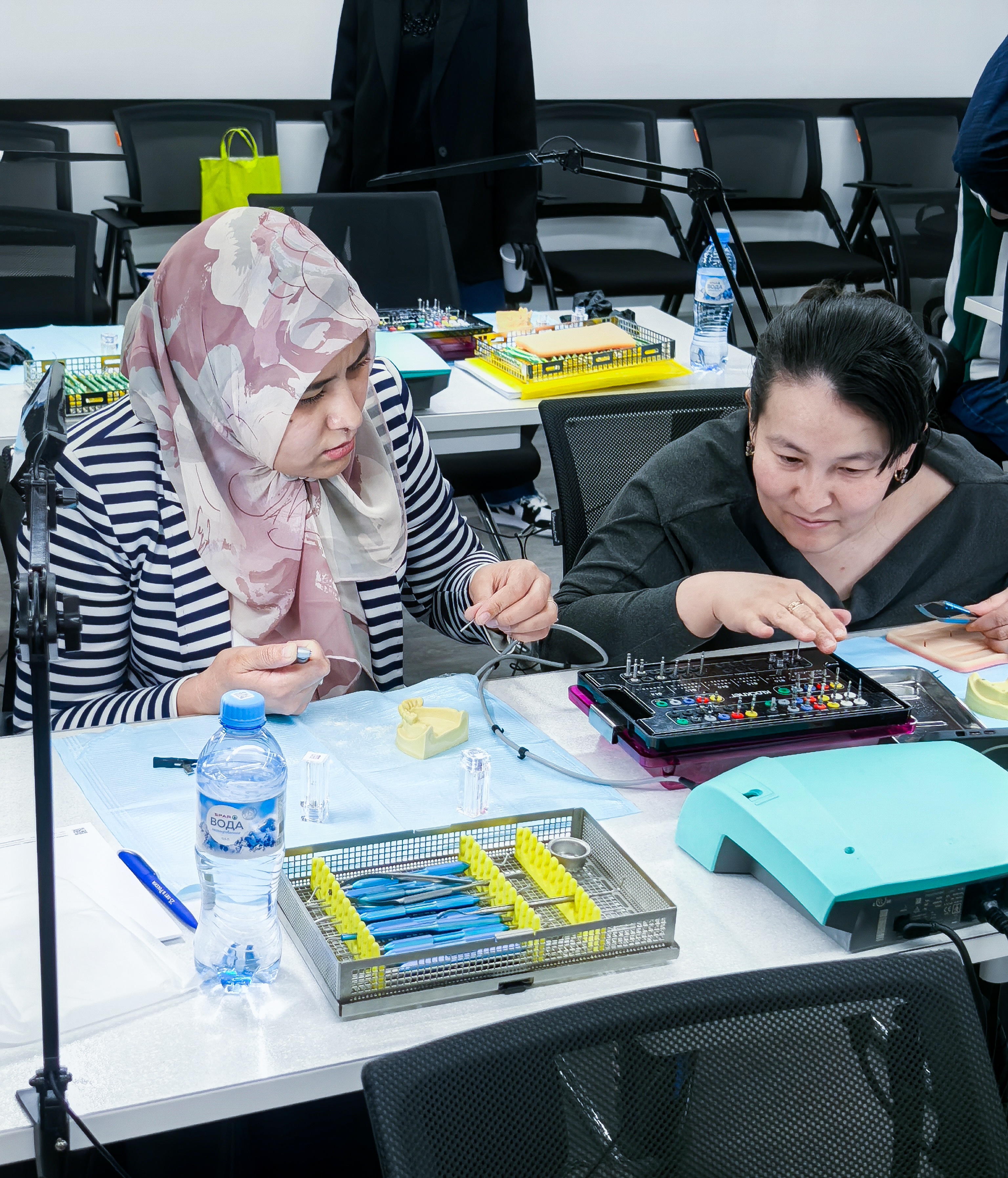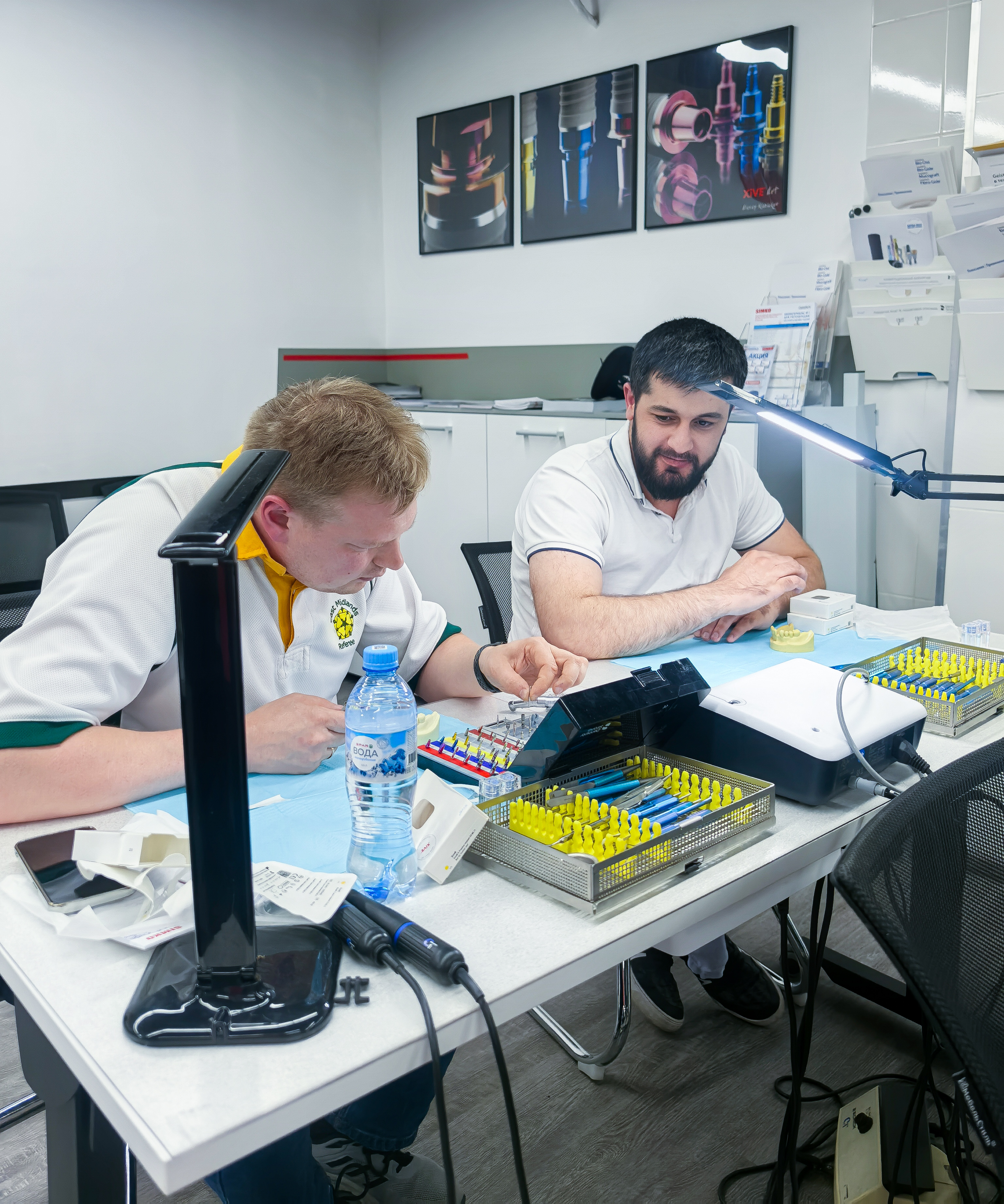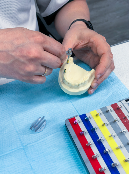 Установка учебного имплантата в модель с помощью физиодиспенсера и хирургического набора.