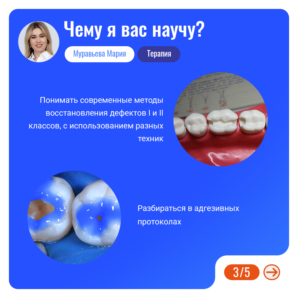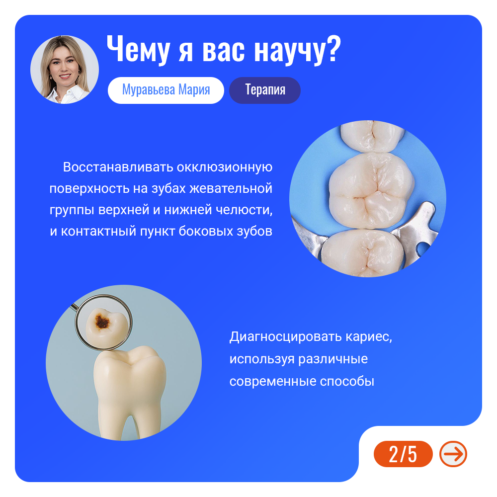 Муравьева Мария Анатольевна специализируется на таких направлениях как: миниинвазивная стоматология, зубосохраняющие методики, эстетическая реставрация зубов, эндодонтическое лечение, микропротезирование.