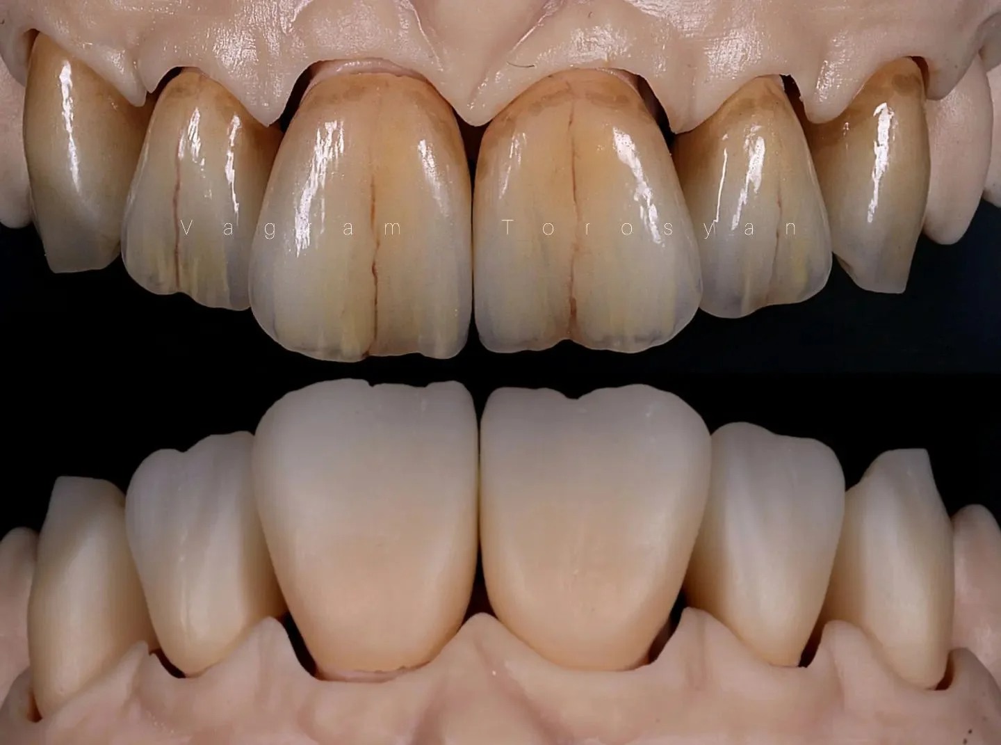 Тот случай, когда необходимо вписать один зуб или включенный мост в зубной ряд и нам необходимо добиться на полной анатомии индивидуализации. Где-то глубокая эмаль, где-то прозрачность, где-то новое ядро, где-то не такую структуру как на стандартных работах. Стираемость, переходы дентин, прозрачка, трещины глубокие и поверхностные, меловидные пятна.