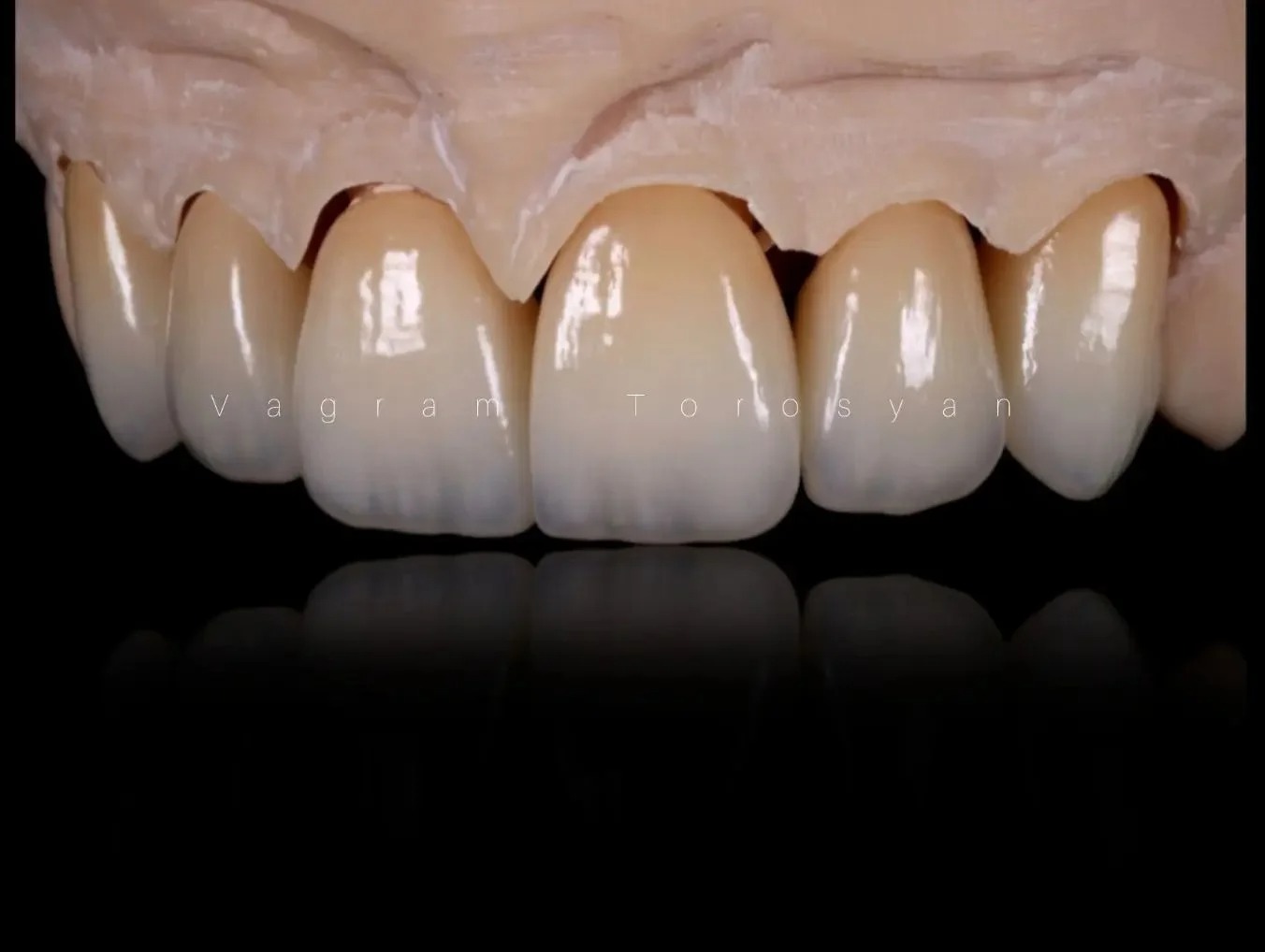 - Контурирование и карвинг для создания симметрии формы и морфологии синтезированного циркона 6-ти фронтальных зубов.